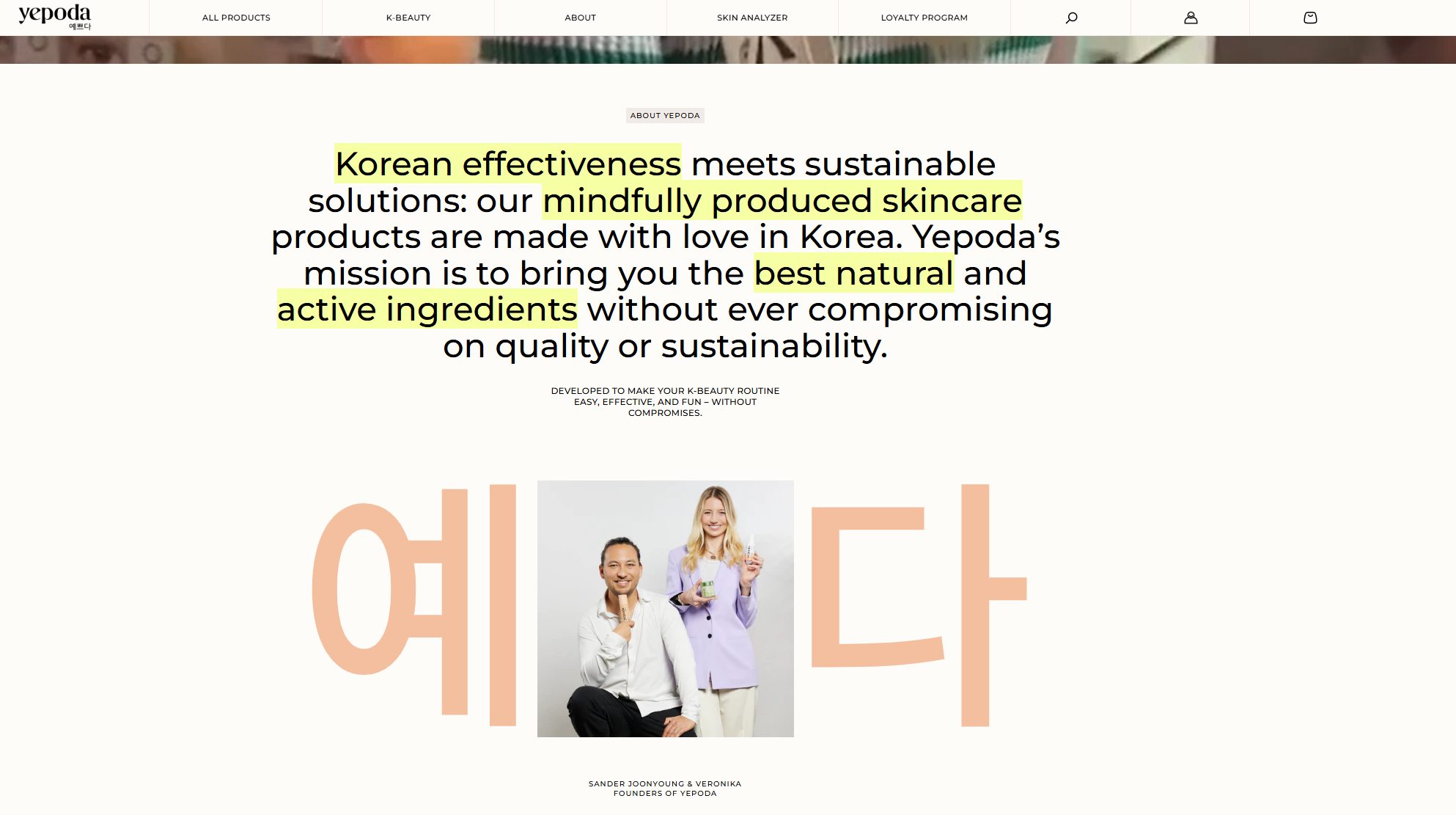 독일에서 런칭한 뷰티 브랜드 'Yepoda(예쁘다)'는 한국 뷰티 스타일에 영감을 받아 유럽 시장에 맞춘 화장품 브랜드로, 웹페이지 자체가 K-컬처를 기반으로 브랜딩을 하고 있습니다. 웹페이지에 들어가보면 '이게 정말 독일인이 런칭한 브랜드?'라고 생각할 정도로 K-컬처의 다양성이 담겨있습니다.
