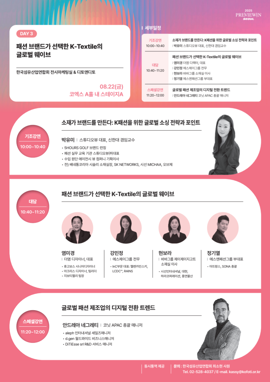 오는 22일(금) 오전 10시, 한국섬유산업연합회와 디토앤디토가 함께 개최하는 2025 PIS의 글로벌 패션포럼은 K-패션의 브랜드 가치를 높이기 위한 K-텍스타일과의 소싱 전략에 대해 이야기해보는 자리입니다. 오늘(20일)부터 시작되는 프리뷰인서울에서 새로운 기회를 만나보세요~!