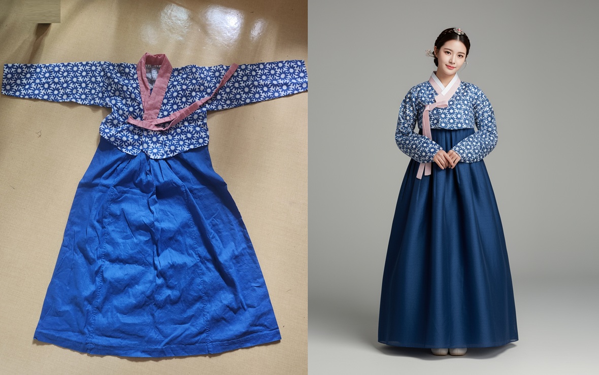 왼쪽은 바닥에 놓고 촬영한 '아름한복' 착장컷이며, 오른쪽은 왼쪽 사진을 바탕으로 '나노바나나'를 활용해 생성한 모델 룩북입니다. |