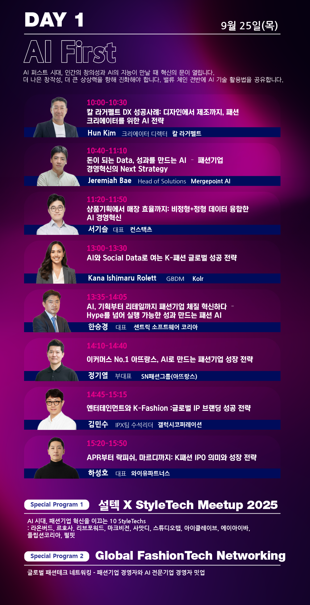 [설텍 2025] 컨퍼런스는 AI 주제만 있는건가요? 아닙니다. 이번 [설텍 2025]는 CO:EVOLVE를 주제로 패션 현장에서 패션 AI 기술과 협력해 어떻게 진화할 지, 글로벌 플랫폼 및 이커머스 솔루션 기업들과 협업해 어떻게 글로벌 시장까지 확장할 지가 핵심입니다.