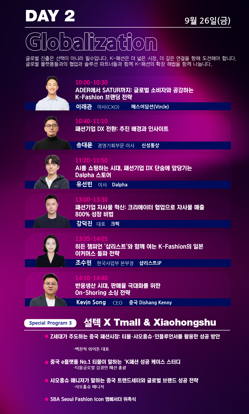 글로벌 디지털 마케팅 전문기업 와이톤과 함께 [스페셜 프로그램]을 운영, 알리바바 티몰글로벌의 패션 부문을 총괄하고 있는 Paul Kim(김경민) 총괄, 샤오홍슈 매니저가 전하는 글로벌 패션 브랜드 성공 전략에 대한 인사이트를 제공합니다. 와이톤은 글로벌 디지털 마케팅 노하우 및 크리에이터 이코노미를 어떻게 활용할 지를 공유할 예정입니다.