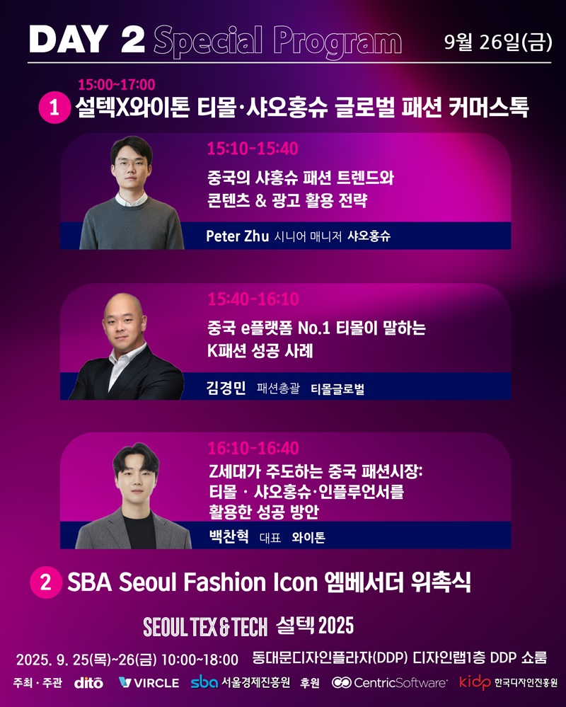 김경민 티몰글로벌 패션총괄은 중국 e플랫폼 No.1 티몰이 말하는 K패션 성공 사례를, Peter Zhu 샤오홍슈 시니어 매니저는 중국의 샤홍슈 패션 트렌드와 콘텐츠 & 광고 활용 전략에 대해 소개합니다.